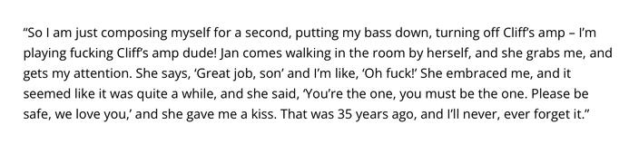 “No, I was out of my head, because I really thought I did well,” he elaborated. “And I thought I played how I was supposed to play.”…“Lars and James were the original garage band duo, as far as that goes,” he says. "They always made the records that way, from [the 1982 demo cassette] No Life ’Til Leather, it was Lars and James, guitar and drums. On the original No Life ’Til Leather cassette – if you happen to ever see a real copy or a photo of a real copy – in Lars’ handwriting, in ink pen, on the label of the cassette, [it reads] ‘Turn bass down on stereo’. On No Life ’Til Leather!”“…Lars didn’t want [that] because it messed with his drums somehow, so when he sends the demo out to fucking Combat Records and wherever, [his instruction is] ‘Turn the bass down before you even listen to this.’ Before you even get it going, just turn the bass down.
